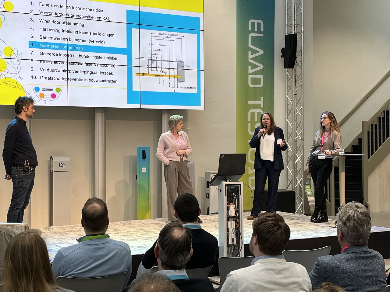 Werken met elektrisch materieel is een belangrijke stap in verduurzaming van de kabels-en-leidingenbranche. Niek van Onna van de gemeente Arnhem vertelde hoe zij emissiereductie hebben vastgelegd in beleid, na een succesvolle pilot in de Hugo de Frootstraat, waar onder andere elektrisch materieel, asfaltreductie en circulaire materialen werden toegepast.