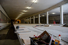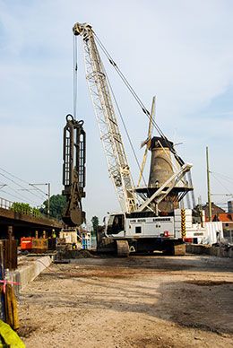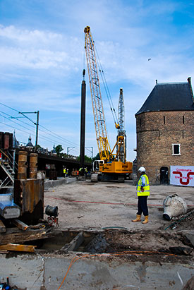 <<(foto)Terwijl op de proeflocatie alles in gereedheid wordt gebracht, gaat de bouw van de diepwanden van de westelijke tunnelbuis door. (Foto: Peter Juijn)