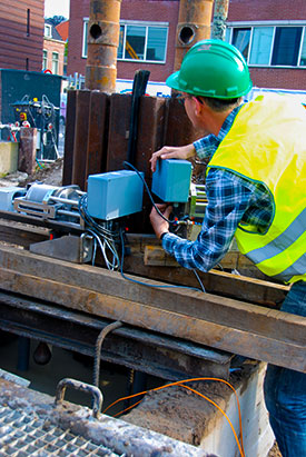 “Voor de proef maken we twee aaneensluitende diepwandpanelen in de bouwkuip van de westelijke tunnelbuis van het project Spoorzone Delft, vlakbij de Bagijnetoren. De panelen bouwen we haaks op de diepwanden van de tunnel. Ze staan vrij van de tunnelwanden en reiken tot ongeveer veertien meter onder het maaiveld. Woensdag 28 augustus jl. hebben we de sleuf voor de panelen gegraven. De volgende ochtend hebben we de wapeningskorven voor beide panelen in de sleuf geplaatst. Vervolgens hebben we in de sleuf van het eerste paneel onze meetinstrumenten aangebracht. Het betreft apparatuur waarmee we het niveau van het beton tijdens het storten op vier plekken in de sleuf nauwkeurig kunnen volgen en glasvezelkabels om de temperatuur te meten. Verder zijn er aan de wapeningskorven buizen gemonteerd om later de crosshole-metingen te kunnen doen. Nadat alle apparatuur was aangebracht en getest, zijn we het beton gaan storten. Bij het tweede paneel hebben we dezelfde stappen gevolgd, alleen zit hier veel meer tijd tussen ontgraven en storten. We hebben dit paneel namelijk pas negen dagen later gestort.”