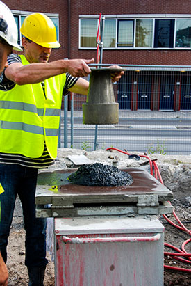 <<(foto) Het storten van de eerste lading beton. Een collega van Van Dalen gooit de digitale chips in de betonstroom . (Foto: Peter Juijn)