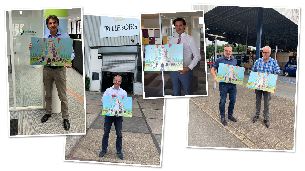 COB-tv werd afgesloten met de onthulling van de Participantenparade, een kunstwerk dat speciaal is gemaakt ter ere van de organisaties die het 25-jarig bestaan van het COB meevieren. De parade is groots te bewonderen in een van de vergaderzalen van het COB. De organisaties die in het kunstwerk zijn verwerkt, krijgen elk een eigen exemplaar, zoveel mogelijk persoonlijk overhandigd. Hiernaast ziet u het cadeau in handen van Bard Louis (MH Poly), Frans Melchers (Trelleborg), Coert Ruseler (Antea Group), Harry de Haan (Elumint) en Arie Bras (Kiltunnel).