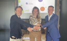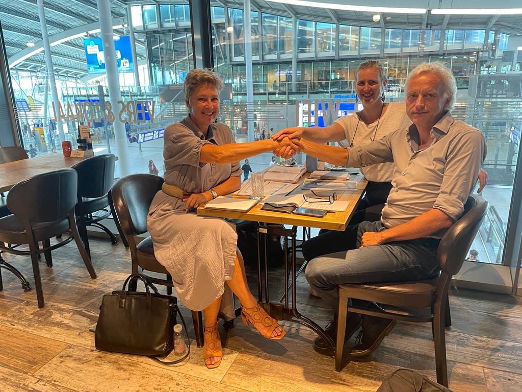 Boven vlnr: Coördinator Rudi Zoet (COB), Welmoed Visser Welmoed Visser (KBF) en coördinator Jos Wessels (COB) slaan de handen ineen.