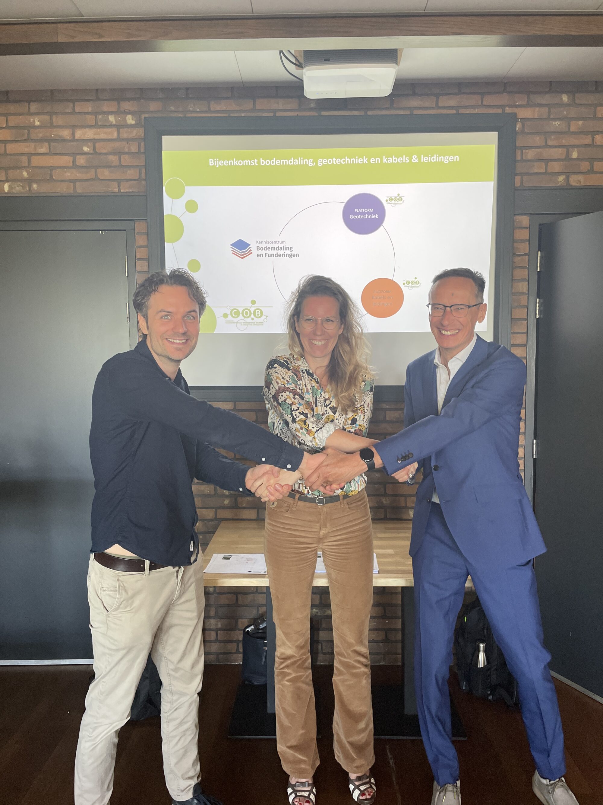 Onder vlnr: Programmamanager Edith Boonsma (COB) schudt de handen van Karin Sant en Vincent Breij (Bodembreed Academie) die gaan deelnemen in het COB-platform Kabels en leidingen.