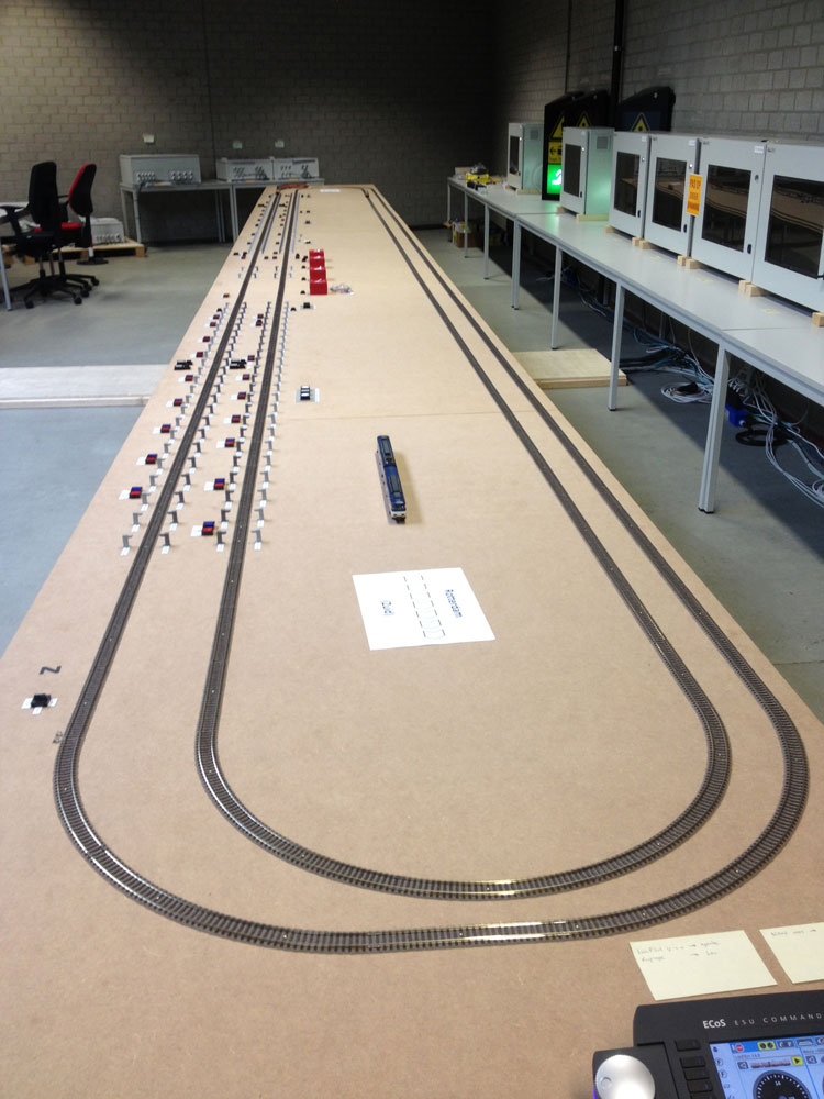 Het testen van de werking van de TTI en van de interactie tussen apparatuur en spoorverkeer vindt plaats in een gebouw van Siemens, de toeleverancier van onder andere de automatiseringssystemen voor de tunneltechnische apparatuur. Chris van Cappellen, projectmanager TTI namens CCL, legt uit waartoe de modelspoorbaan dient. “We hebben het tunneltraject inclusief installaties nagemaakt op een schaal van 1:200. In de echte spoortunnel bevinden de sensoren van het treinstilstanddetectiesysteem zich straks om de vijfentwintig meter. Hier vind je dus om de 12,5 centimeter een sensor voor treinstilstanddetectie.”