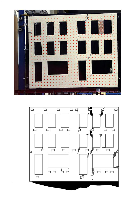 Giardina maakte daarom een 2D semi-gekoppeld eindige-elementenmodel met een scheurmodel voor het metselwerk en een niet-lineaire tussenlaag voor het simuleren van de grond-gebouwinteractie. Ze gebruikte de resultaten van het experiment om dit model te valideren (Figuur 1). Vervolgens kon ze met het model onderzoeken in hoeverre openingen, materiaaleigenschappen, initiële schade, initiële condities, normaal- en afschuifgedrag van de tussenlaag en opgelegde zettingsprofielen de gevoeligheid van een gebouw voor schade beïnvloeden. De resultaten van dit parameteronderzoek stellen kwantitatief vast hoe groot de invloed is van de normaalstijfheid in grond-gebouwinteractie en van de materiaalparameters die het quasi-brosse gedrag van metselwerk bepalen.