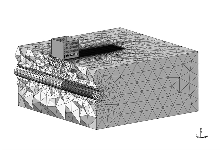 Een 2D-model is echter niet voldoende: hiermee kan het voortgaande 3D-verplaatsingsveld zoals dat bij ontgravingen ontstaat, en de daarmee gepaard gaande torsierespons van een gebouw, slechts in beperkte mate beschreven worden. Giardina ontwikkelde daarom een 3D-model waarin het gebouw, de grond en het ondertunnelen zijn verwerkt (Figuur 2).