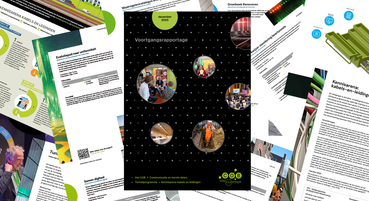 Voor het tunnelprogramma zijn vanaf de start elk halfjaar voortgangsrapportages gemaakt. Sinds juni 2020 is de rapportage uitgebreid met het beschrijven van de voortgang van álle COB-activiteiten. Het is inmiddels een volwaardige publicatie, voorzien van mooie beelden en een uitgebreid voorwoord. Met dit document kunt u met collega’s of ketenpartners het gesprek aangaan over gezamenlijke kennisontwikkeling. Sinds 2020 is het jaarverslag geïntegreerd in de voortgangsrapportage van juni in het jaar erna.