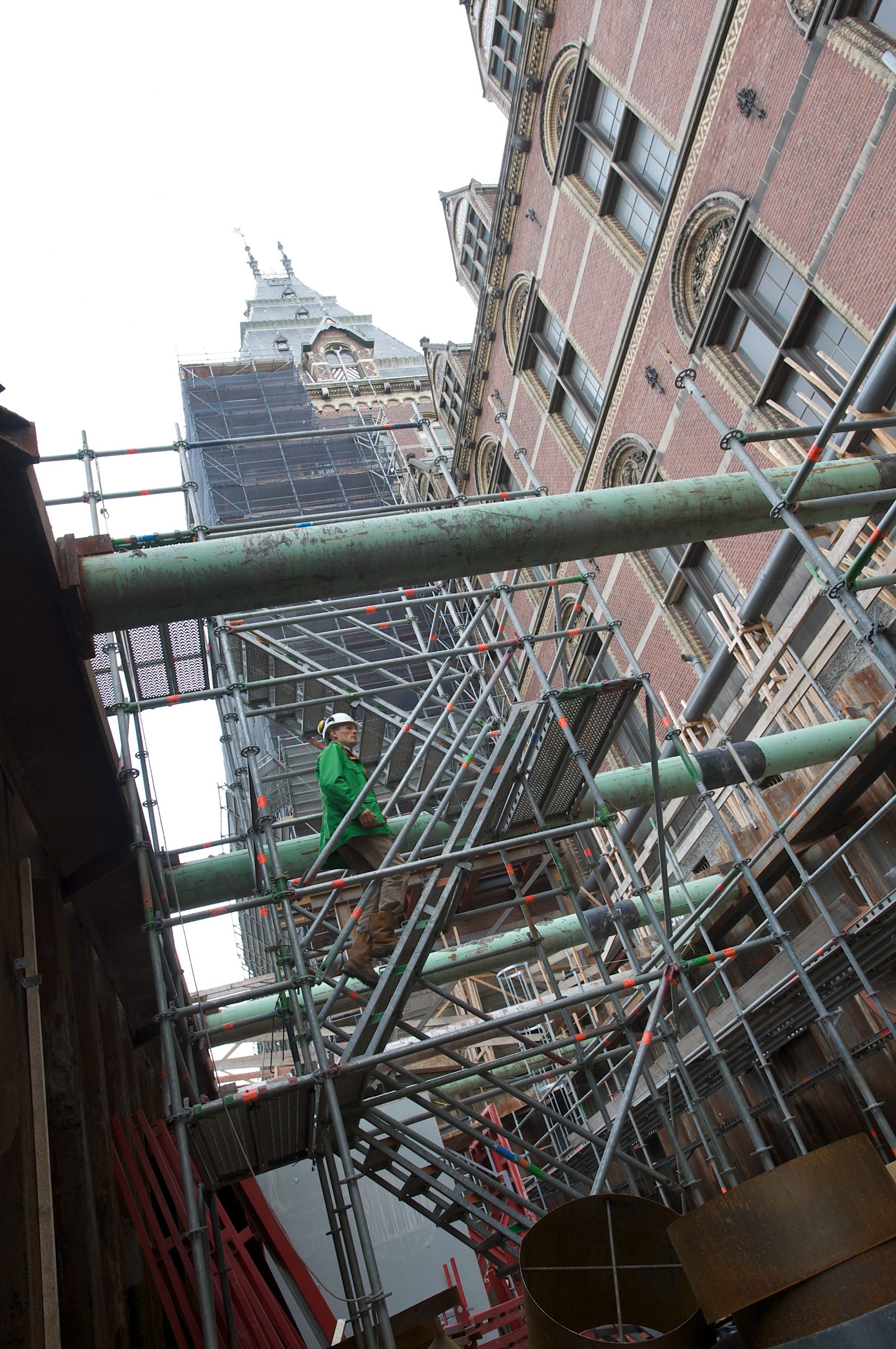 Rond elke kolom is een stalen frame gebouwd dat zijn krachten afdroeg naar tijdelijke buispalen. Op het frame zijn vijzels geplaatst. Deze ondersteunden stalen balken die door de poeren waren aangebracht. Aangezien de vloer van de passage – die zorgde voor de horizontale stabiliteit – werd verwijderd, is een stalen stabiliteitsframe tussen de bovengelegen metselkolommen gemaakt. Door de vijzels gecontroleerd en stapsgewijs iets op te draaien kon de belasting geleidelijk worden overgebracht naar het draagframe. Vervolgens zijn de poeren gesloopt en de nieuwe kolommen gemaakt. Daarna is de gebouwbelasting weer teruggebracht naar de oorspronkelijke fundering en is een nieuwe passagevloer gemaakt.