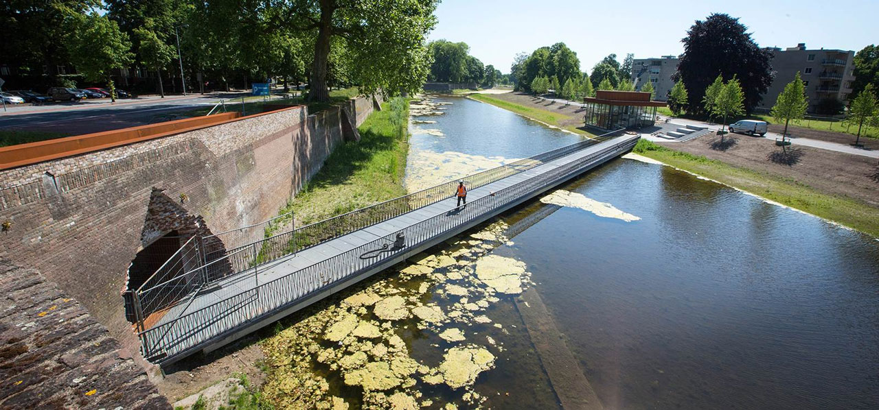De voetgangersingang van de parkeergarage ligt aan de zuidzijde van de gracht. Van daar lopen bezoekers via een loopbrug over de gracht door een opening in de vestingmuur naar de binnenstad.