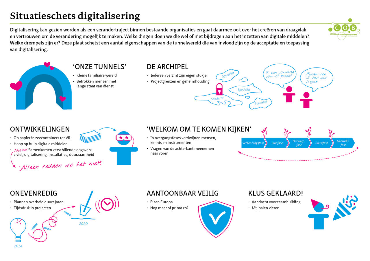 Digitalisering is niet iets dat je zomaar even doorvoert. Het is een proces, een verandertraject. Om een verandering mogelijk te maken, zijn draagvlak en vertrouwen nodig. Dat begint met kijken en luisteren naar wat er gebeurt in tunnelprojecten op momenten van verandering en naar wat de achterliggende belangen van alle partijen zijn. De analyse in dit project is bedoeld als kennisbasis om verdere invulling te kunnen geven aan toepassing van digitale middelen en aan de overdracht van informatie tussen partijen. Er komt zicht op de manier (leidraad) van omgaan met het invoeren van digitalisering.