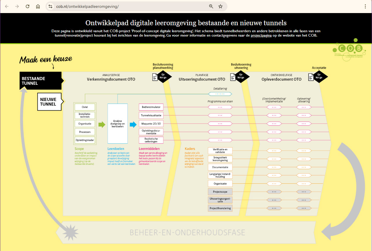 In de praktijk blijkt het vrijwel onmogelijk om alle betrokkenen bij tunnelveiligheid voortdurend ‘getraind genoeg’ te houden, gebaseerd op alle mogelijke scenario’s. Digitale middelen kunnen uitkomst bieden, want hiermee kan OTO veel flexibeler plaatsvinden. Het COB-netwerk heeft daarom de ontwikkeling van virtueel OTO in kaart gebracht. Vervolgens is onderzoek gedaan naar de inrichting van een digitale omgeving waarin medewerkers van zowel de beheerorganisatie als de hulpdiensten kunnen trainen en oefenen, zie rapport Concept digitale leeromgeving.